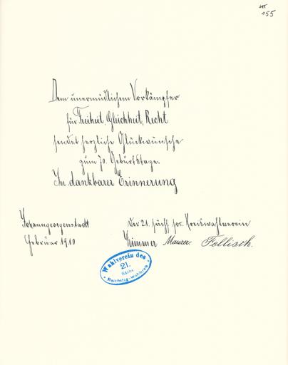 | Keywords: Goldenes Buch zum 70. Geburtstag August Bebel 1910 Seite 155.jpg  Goldenes Buch zum 70 Geburtstag August Bebel 1910 Seite_ jpg 154 156 Glückwunschschreiben zum 70 Geburtstag von August Bebel SPD-Kreisorganisation des 21 Sächsischen Reichstagswahlkreises Johanngeorgenstadt August Bebel zum siebzigsten Geburtstag 22 Februar 1910 / mit einer Nachbemerkung von Ursula Herrmann Reprint des Unikats aus dem Zentralen Parteiarchiv der SED Dietz Verlag Berlin 1989 Lizenzausgabe Saur 1989 ISBN 3-598-07256-2 self scanned from own book 1910 Diverse Goldenes Buch zum 70 Geburtstag August Bebel 1910 PD-old-70-1923 |