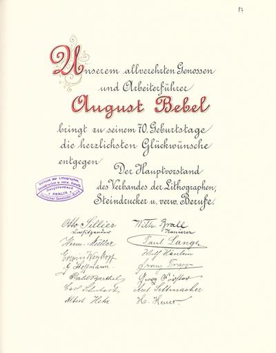 | Keywords: Goldenes Buch zum 70. Geburtstag August Bebel 1910 Seite 087.jpg Goldenes Buch zum 70 Geburtstag August Bebel 1910 Seite_ jpg 086 088 Glückwunschschreiben zum 70 Geburtstag von August Bebel Hauptvorstand des Verbandes der Lithografen Steindrucker und verwandter Berufe August Bebel zum siebzigsten Geburtstag 22 Februar 1910 / mit einer Nachbemerkung von Ursula Herrmann Reprint des Unikats aus dem Zentralen Parteiarchiv der SED Dietz Verlag Berlin 1989 Lizenzausgabe Saur 1989 ISBN 3-598-07256-2 self scanned from own book 1910 Diverse PD-old-70-1923 Goldenes Buch zum 70 Geburtstag August Bebel 1910 |