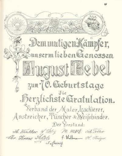 | Keywords: Goldenes Buch zum 70. Geburtstag August Bebel 1910 Seite 090.jpg Goldenes Buch zum 70 Geburtstag August Bebel 1910 Seite_ jpg 089 091 Glückwunschschreiben zum 70 Geburtstag von August Bebel Vorstand des Verbandes der Maler Lackiere Anstreicher Tüncher und Weissbinder August Bebel zum siebzigsten Geburtstag 22 Februar 1910 / mit einer Nachbemerkung von Ursula Herrmann Reprint des Unikats aus dem Zentralen Parteiarchiv der SED Dietz Verlag Berlin 1989 Lizenzausgabe Saur 1989 ISBN 3-598-07256-2 self scanned from own book 1910 Diverse PD-old-70-1923 Goldenes Buch zum 70 Geburtstag August Bebel 1910 |