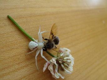 Keywords: Goldenrod crab spider.JPG en A white male goldenrod crab spider feeding on a dead honey bee in a clover flower Own Kata_W 2009-06-22 Own Work Misumena vatia eating insects on flowers
