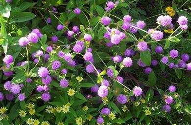 Keywords: gomphrena globosa purple flowers violet globe amaranth bachelor button annual flowering plants ornamental small blossoms blooming green leaves leafy background bright sunny day wildflowers growing gardens