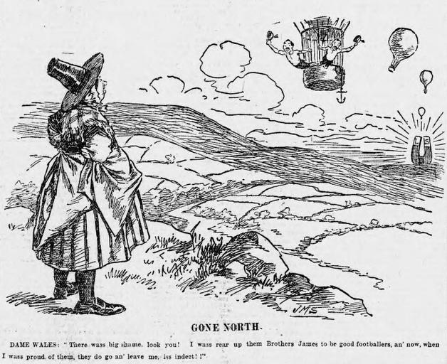 | Keywords: Gone North - JM Staniforth.png en Social cartoon by JM Staniforth Dame Wales complains of two of her best rugby union players brothers David and Evan James 'Going North' by joining rugby league club Broughton Rangers LSD on the magnet represents Pounds/Shillings/Pence http //papuraunewyddcymru llgc org uk/en/page/view/3282618 Evening Express Joseph Morewood Staniforth 1899-01-26 Cartoons by Joseph Morewood Staniforth 1899 in the United Kingdom Rugby league in England 1899 in rugby union Personifications of Wales Balloon aircraft in art 1899 Rugby union in Wales PD-old-70-1923 |