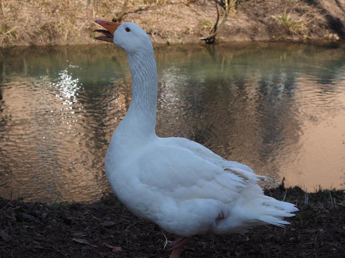 Keywords: goose scream attention animal white livestock bird poultry domestic goose bank river riverside