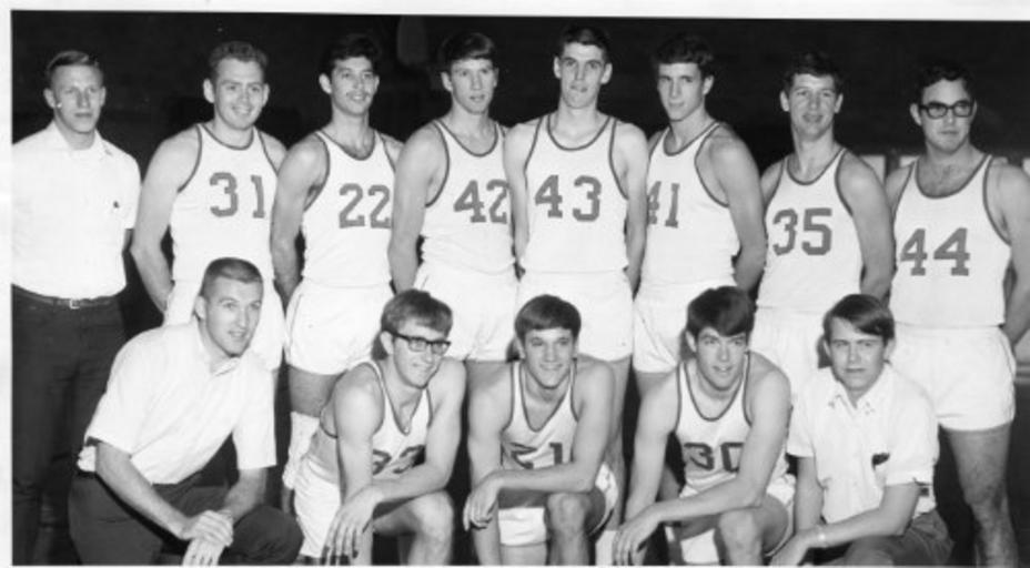 | Keywords: mennonite mennonites sport sports goshen college goshencollege goshen college students goshencollegestudents basketball men black white photograph athletic athletics college students collegestudents team blackandwhite groupshot people monochrome team sport black and white Goshen College Athletics 1958-1974 Caption: The GC Basketball team, a 106-75 winner over Olivet Nazarene in its season opener Sat. night, hosts Huntington College in its home open tonight. Members of this year's squad, from left in the front row are Coach Fred Litwiller, Bob Cross, Bob Zuercher, Ken Pletcher and manager, Darryl Lutes. Back row, manager Lloyd Kanagy, Art Cosgrove Jr., John Histand, Keith Springer, Lyle Gaff, Maurice Miller, Roger Springer, and George Liechty. Photo dated November 18, 1968 Citation: Goshen College Information Services Audiovisual Materials, 1958-1974. V-04-011. Mennonite Church USA Archives - Goshen. Goshen, Indiana. Goshen College Athletics 1958-1974 Caption: The GC Basketball team, a 106-75 winner over Olivet Nazarene in its season opener Sat. night, hosts Huntington College in its home open tonight. Members of this year's squad, from left in the front row are Coach Fred Litwiller, Bob Cross, Bob Zuercher, Ken Pletcher and manager, Darryl Lutes. Back row, manager Lloyd Kanagy, Art Cosgrove Jr., John Histand, Keith Springer, Lyle Gaff, Maurice Miller, Roger Springer, and George Liechty. Photo dated November 18, 1968 Citation: Goshen College Information Services Audiovisual Materials, 1958-1974. V-04-011. Mennonite Church USA Archives - Goshen. Goshen, Indiana. |