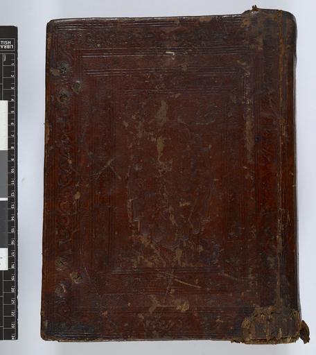 | Keywords: Gospel Lectionary with ekphonetic neumes (Greg.-Aland l 1495=-l 459-=-l 1205-) - Lower cover (Add MS 37007).jpg  Style Treasure binding Religious miscellaneous Pictorial Byzantine; Caption Lower cover; Colour Brown; Edge Plain exhibition history Decorative Technique Tooled in blind; Cover Material Goatskin includes morocco turkey etc Binding Brown leather On the front cover is an embossed silver and gold plate depicting Christ enthroned between the Virgin and another bearded figure; symbols of the four Evangelists in the corners Origin Eastern Mediterranean owned by and likely created at the Monastery of St Nicholas in Pentrochonte north of Berat Albania ownership inscription f 1r see further Cataldi Palau 1997 2008 Provenance Theodore Mouzachos Lord of Berat between 1389 and 1412 received the manuscript for safe-keeping in 1399 from Daniel the hieromonk at the Monastery of St Nicholas along with a number of other manuscripts object history Text 13c; Unspecified; Unspecified object type Cc-zero place of creation Binding Eastern Mediterranean place of discovery Unspecified British Library image http //www bl uk/catalogues/bookbindings/LargeImage aspx RecordId 020-000019575 ImageId ImageId 57800 Copyright BL Gospel Lectionary with ekphonetic neumes Greg -Aland l 1495 l 459 l 1205 Uploaded with GWToolset Gospel Lectionary with ekphonetic neumes Greg -Aland l 1495 l 459 l 1205 - Lower cover Add MS 37007 http //www webarchive org uk/bldatasets/bindings/add_ms_37007_fbrigv jpg Bookbinding 13th-century bookbinding British Library Bookbindings Taken with Phase One IQ140 |
