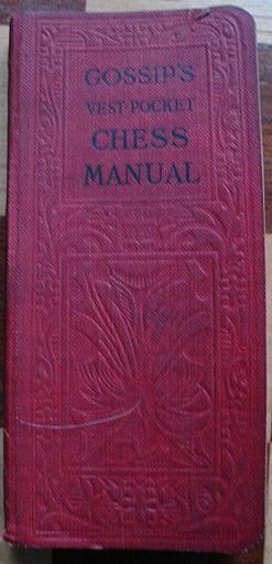 | Keywords: Gossip Vest-Pocket Chess Manual.jpg en Photo taken by me of front cover of book Gossip's Vest-Pocket Chess Manual by George H D Gossip died 1907 No copyright indicated Published by David McKay 604-8 South Washington Square Philadelphia; no date specified photo of cover of book Gossip's Vest-Pocket Chess Manual photo by me; designer of book cover unknown PD-old Chess books | ||||