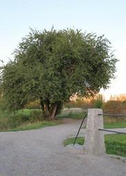 Keywords: Göta Landsväg, Årstafältet.JPG Göta landsväg på Årstafältet Stockholm Vy norrut från stenbron på fältet Äppelträdet Årsta Vilda i mitten I bakgrunden skymtar höghusen i Valla Fornminne 10301500340001 RAÄ-nr Brännkyrka 34 1 own 2011-09-29 Jssfrk se Göta landsväg - stretch over Årstafältet Apple trees in Sweden