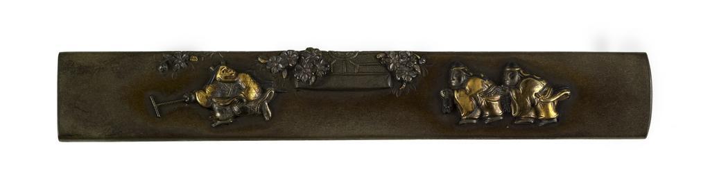 | Keywords: Got么 Sokuj么 - Kozuka with the D么j么ji Temple Bell - Walters 51805.jpg This design is a scene from the story of D鬸鬸i temple The temple bell is shown at the center of the composition At the right are two monks holding prayer beads and praying A woman dances at the left holding a mallet for striking the bell The monks at D鬸鬸i used the bell to hide a traveling monk who was trying to escape a woman who was pursuing him She thought he had promised to marry her and in her anger at his rejection of her transformed herself into a dragon She coiled herself around the bell and killed the hidden monk by breathing fire on the bell In the noh and kabuki plays about the story a dancer who is the spirit of the jealous woman comes to the temple to celebrate the installation of a new bell She dances under the bell and when it falls on her she is transformed into a dragon The dancer is shown here as a fox Foxes were commonly thought to take the form of a beautiful woman in order to cause mischief between 1600 1631 early Edo shibuichi gold cm 9 8 l accession number 51 805 10696 Henry Walters Baltimore date and mode of acquisition unknown Walters Art Museum Henry Walters Acquired by Henry Walters signature place of origin Kyoto Japan Walters Art Museum license Kozuka in the Walters Art Museum Got么 Sokuj么 Media contributed by the Walters Art Museum needs category review Reliefs of dancers on Japanese sword fittings |