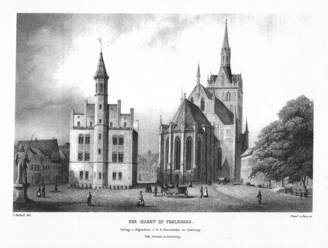 | Keywords: Gottheil-Poppel-Kurz Der-Markt-in-Perleberg beschriftet.png en Der Markt in Perleberg taken from Brandenburgisches Album Eine Sammlung in Stahlstich ausgeführter Ansichten der Städte Architecturen und Denkmäler der Mark Brandenburg Steel engraving by Poppel and Kurz based on a drawing by Gottheil The image pictures Perleberg ™s marketplace From left to right Roland statue town hall St Jacobi church Caption bottom left J Gottheil del bottom right Poppel u Kurz sc bottom center DER MARKT IN PERLEBERG Verlag u Eigenthum v B S Berendsohn in Hamburg Wilh Krenkel in Perleberg de žDer Markt in Perleberg aus žBrandenburgisches Album Eine Sammlung in Stahlstich ausgeführter Ansichten der Städte Architecturen und Denkmäler der Mark Brandenburg Stahlstich von Poppel und Kurz nach einer Zeichnung von Gottheil Das Bild zeigt den Markt von Perleberg Links die Rolandstatue mittig das Rathaus rechts die Kirche St Jacobi Beschriftung unten links J Gottheil del unten rechts Poppel u Kurz sc unten mittig DER MARKT IN PERLEBERG Verlag u Eigenthum v B S Berendsohn in Hamburg Wilh Krenkel in Perleberg The image is a scan of a reprint sold in a bookstore The image has originally been published by B S Berendsohn in Hamburg in Brandenburgisches Album Eine Sammlung in Stahlstich ausgeführter Ansichten der Städte Architecturen und Denkmäler der Mark Brandenburg in or shortly before 1860 The caption on the image also names Wilh Krenkel of Perleberg “ so it might be a copy of a 19th century reprint by Wilh Krenkel Julius Gottheil Johann Gabriel Friedrich Poppel Georg Michael Kurz < 1860 Cropped sheared resized version with stronger contrast thumb left 53 0775 11 8630 region DE-BB_scale 200_heading SWbW PD-old Squares in Perleberg Johann Gabriel Friedrich Poppel Georg Michael Kurz Steel engravings Town hall in Perleberg Stadtpfarrkirche St Jakobi Perleberg Julius Gottheil |