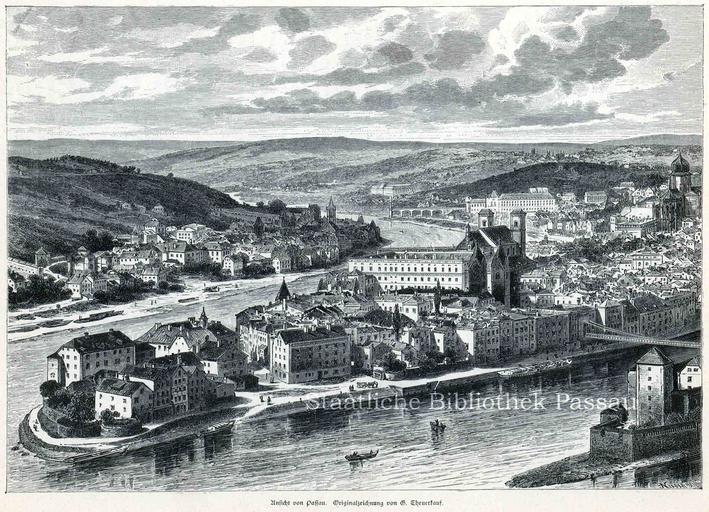 Keywords: Gottlob Theuerkauf Passau.jpg de Blick auf Passau vom Klosterberg aus Holzstich 17 2 x 24 6 cm Staatliche Bibliothek Passau http //www staatliche-bibliothek-passau de/staadi/nid/phs/082 html Creator Gottlob Theuerkauf ca 1881 PD-old Gottlob Theuerkauf History of Passau Passau in art Wood engravings |