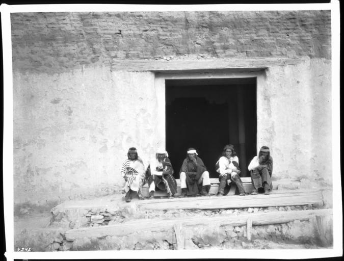 | Keywords: Governor Eusebius and his staff sitting on the steps of the old church, Acoma Pueblo, New Mexico, 1886 (CHS-4545).jpg en <br> Governor Eusebius and his staff sitting on the steps of the old church Acoma Pueblo New Mexico 1886 Photograph of Governor Eusebius and his four staff sitting on the steps of the old church Acoma Pueblo New Mexico 1886 The Governor is second from left The three steps leading to the church entry are constructed from wooden beams with a foundation of rocks The lower part of the church wall is stuccoed but bare to the underlying adobe brick above The men all wear striped blankets and cloths wrapped around their heads Call number CHS-4545 Photographer James George Wharton Filename CHS-4545 Coverage date 1886 Part of collection California Historical Society Collection 1860-1960 Type images Geographic subject city or populated place Acoma Pueblo Repository name USC Libraries Special Collections Accession number 4545 Microfiche number 1-160-46 Archival file chs_Volume96/CHS-4545 tiff Part of subcollection Title Insurance and Trust and C C Pierce Photography Collection 1860-1960 Repository address Doheny Memorial Library Los Angeles CA 90089-0189 Geographic subject country USA Format aacr2 4 photographs transparency photonegative photoprints b w ; 25 x 20 cm 17 x 22 cm Rights Digitally reproduced by the USC Digital Library; From the California Historical Society Collection at the University of Southern California Subject adlf religious facilities Project USC Repository email specol usc edu Identifying number unidentified no James-1374 Contributing entity California Historical Society Date created 1886 Publisher of the digital version University of Southern California Libraries Format aat transparencies; negatives photographic ; photographic prints; photographs Geographic subject state New Mexico Legacy record ID chs-m16880; USC-1-1-1-13461 Access conditions Send requests to address or e-mail given Phone 213 821-2366; fax 213 740-2343 Subject file heading Indians -- Acoma Subject lcsh Indians of North America; Acoma Indians Subject Acoma Indians; Governor Eusebius; Sheriff Louis; Acoma; Acoma Indians 1886 date created George Wharton James 1858 1923 http //digitallibrary usc edu/cdm/ref/collection/p15799coll65/id/16802 PD-old-70-1923 Images from USC Digital Library uploaded by Fæ Photographs by George Wharton James California Historical Society Collection 1860-1960 Acoma Pueblo |