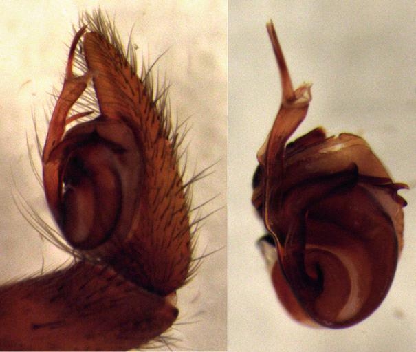 Keywords: Gradungula sorenseni (male palp).jpg en Gradungula sorenseni topotype male palp photo taken by me S E Thorpe 2012-04-05 NEW ZEALAND WD Franz Josef L Wombat tk 200 m rata-kamahi-Fuchsia forest YPT 8-11 Nov 2007 J W Early AMNZ L16511 Gradungula sorenseni |