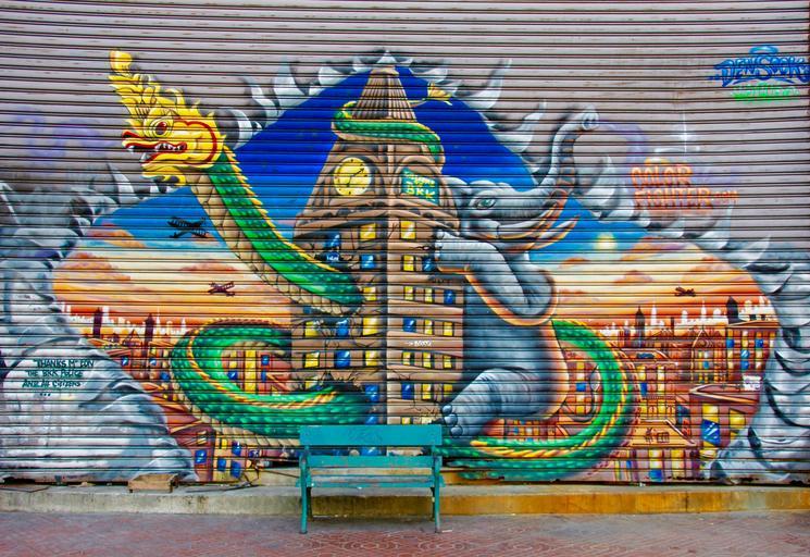 Keywords: graffiti bank wall colorful color dragons elephant bench wood seat relax out lazing around wooden bench