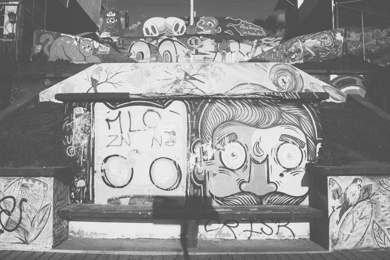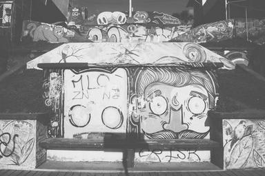 Keywords: graffiti street art painting wall urban gray spray city paint grunge culture artistic background bench murals black and white