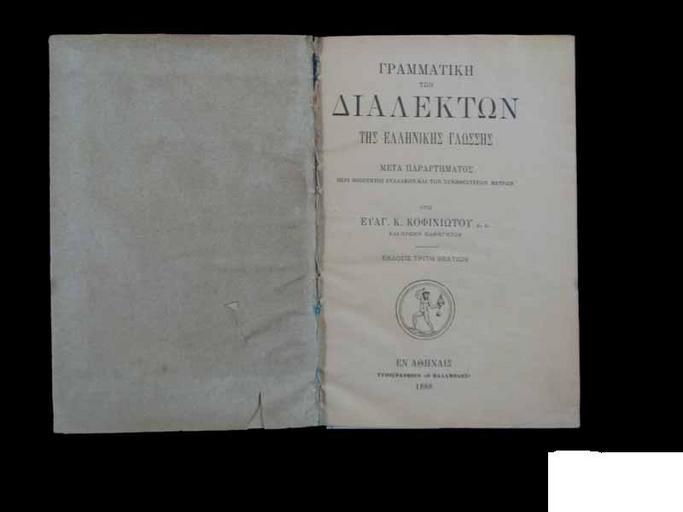 Keywords: Grammar of Greek dialects cover.jpg Grammar of Greek dialects cover Εξώφυλλο Γραμματική των Διαλέκτων της Ελληνικής Γλώσσης Ε Κοφινιώτη own ; transferred from http //el wikipedia org el wikipedia; transferred to Commons by User MARKELLOS using http //tools wikimedia de/~magnus/commonshelper php CommonsHelper <br/> Original text Digital library of G Triantaphyllou 1888-01-01<br/> 2010 01 29 first version ; 2010 01 29 last version Ε Κοφινιώτης Original uploader was Triantap at http //el wikipedia org el wikipedia This image is in the public domain PD-Art Original upload log page el wikipedia DIALEKT jpg 2010-01-29 08 35 Triantap 800600 33592 bytes <nowiki>Αναστράφηκε στην εκδοχή της 08 30 29 Ιανουαρίου 2010</nowiki> 2010-01-29 08 31 Triantap 800600 33592 bytes <nowiki> Περιγραφή Πηγή Ημερομηνία Δημιουργός Άδεια χρήσης </nowiki> 2010-01-29 08 30 Triantap 800600 33592 bytes <nowiki> Περιγραφή Πηγή Ημερομηνία Δημιουργός Άδεια χρήσης </nowiki> 2010-01-29 08 21 Triantap 800600 35190 bytes <nowiki> Πληροφορίες εικόνας Περιγραφή Εξώφυλλο Γραμματική των Διαλέκτων της Ελληνικής Γλώσσης Ε Κοφινιώτη Πηγή Digital library of G Triantaphyllou Ημερομην</nowiki> Greek culture |