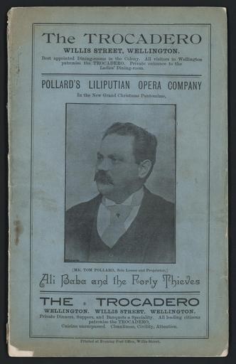 Keywords: Blue front cover shows a portrait of Mr Tom Pollard. At top and bottom are advertisements for the Trocadero in Willis Street, for private dinners, suppers and banquets - the "best appointed dining-rooms in the colony". Quantity: 1 colour photo-mechanical print(s). Physical Description: Photolithograph on programme cover, 215 x 135 mm. Grand Opera House (Wellington) :Pollard's Liliputian Opera Company in the new grand Christmas pantomime, "Ali Baba and the Forty Thieves". Mr Tom Pollard, sole lessee and proprietor. [Programme front cover. 1894].. Grand Opera House (Wellington) :Pollard's Liliputian Opera Company in the new grand Christmas pantomime, "Ali Baba and the Forty Thieves". Boxing Day, Wed[nesday] 26 [Programme. 1894].. Ref: Eph-A-PANTOMIME-1894-01-front. Alexander Turnbull Library, Wellington, New Zealand. natlib.govt.nz/records/22661101 Blue front cover shows a portrait of Mr Tom Pollard. At top and bottom are advertisements for the Trocadero in Willis Street, for private dinners, suppers and banquets - the "best appointed dining-rooms in the colony". Quantity: 1 colour photo-mechanical print(s). Physical Description: Photolithograph on programme cover, 215 x 135 mm. Grand Opera House (Wellington) :Pollard's Liliputian Opera Company in the new grand Christmas pantomime, "Ali Baba and the Forty Thieves". Mr Tom Pollard, sole lessee and proprietor. [Programme front cover. 1894].. Grand Opera House (Wellington) :Pollard's Liliputian Opera Company in the new grand Christmas pantomime, "Ali Baba and the Forty Thieves". Boxing Day, Wed[nesday] 26 [Programme. 1894].. Ref: Eph-A-PANTOMIME-1894-01-front. Alexander Turnbull Library, Wellington, New Zealand. natlib.govt.nz/records/22661101 |