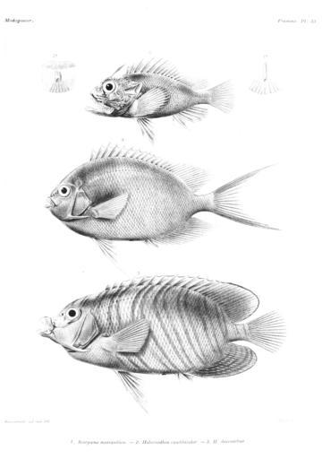 | Keywords: GrandidierMadagascarFishes 0077.jpg Scorpaena mossambica Holacanthus caudibiclor Holacanthus diacanthus Histoire Physique Naturelle et Politique de Madagascar Volume 16 Histoire Naturelle des Poissons atlas http //www archive org/details/histoirephysique16gran web 1885 text Alfred Grandidier 1836-1921 artists various Karmanski pd-old-70 Alfred Grandidier Histoire Physique Naturelle et Politique de Madagascar - Grandidier - Volume 16 Poissons | ||||