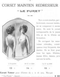 | Keywords: GrandsMagasinsLaboriePage10.png From a advertising pamphlet CORSET MAINTIEN REDRESSEUR LE FURET Nos corsets étudiés perfectionnés souvent imités ne se comparent á aucun autre Ils sont le corset indispensable de la jeune fille et de la fillette en formation Ils corrigent les mauvaises attitudes conséquence trop fréquente des études Ils se font pour tous les âges fillettes jeunes filles dames prix suivante la taille 7 à 14 ans http //fr wikisource org/wiki/Grands_Magasins_Laborie PD-Art Illustrations of people with mirrors 1910s fashion Girls in corset Shoulder corsets Artworks missing infobox template |