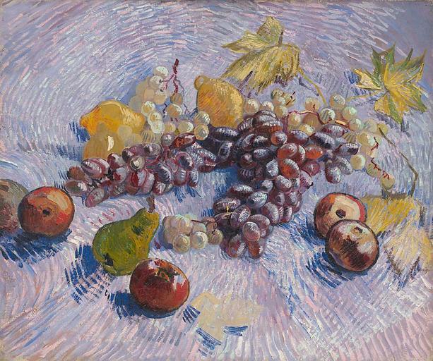 Keywords: Grapes, Lemons, Pears, and Apples 1887 Vincent van Gogh.jpg Artwork Creator Vincent van Gogh oil canvas cm 73 92 1 Institution Art Institute of Chicago object history credit line http //www artic edu/aic/collections/artwork/14586 1887 PD-old-100 Other versions Still Life with Grapes apples lemons and pear by Vincent van Gogh |