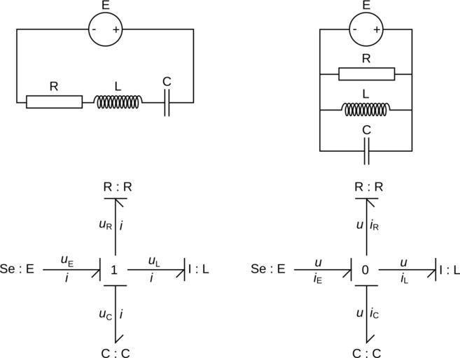 Keywords: Graphe liaison circuit RLC.svg en Bond graph for an RLC circuit serial circuit left and parallel circuit right pag Graphe de liaison pour un circuit RLC circuit série gauche et parallèle droite own Cdang 2010-03-30 inkscape Bond graphs
