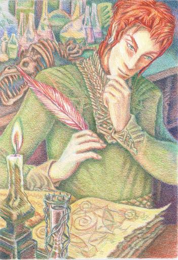 Keywords: graphics watercolor watercolor pencils illustration figure amber portrait riddle mood the alchemist book pen candle hourglass mystery redhead skeleton bone man
