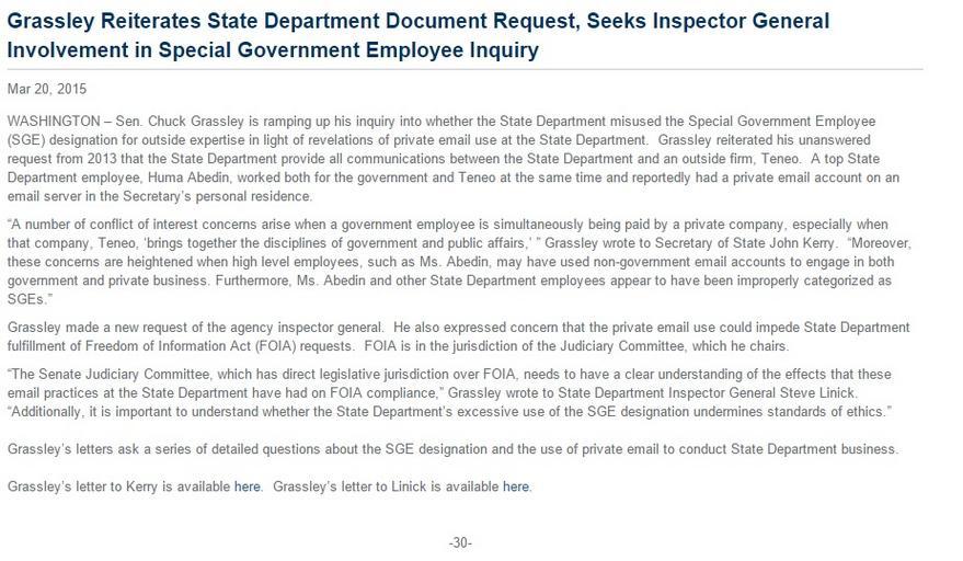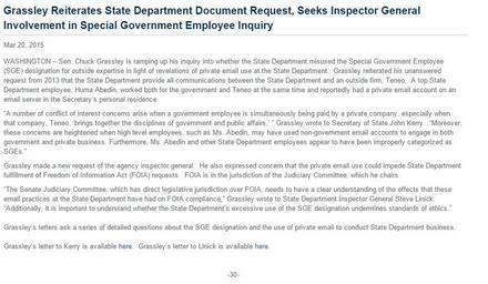 Keywords: Grassley Reiterates State Department Document Request, Seeks Inspector General Involvement in Special Government Employee Inquiry.jpg Grassley Reiterates State Department Document Request Seeks Inspector General Involvement in Special Government Employee Inquiry Mar 20 2015 WASHINGTON “ Sen Chuck Grassley is ramping up his inquiry into whether the State Department misused the Special Government Employee SGE designation for outside expertise in light of revelations of private email use at the State Department Grassley reiterated his unanswered request from 2013 that the State Department provide all communications between the State Department and an outside firm Teneo A top State Department employee Huma Abedin worked both for the government and Teneo at the same time and reportedly had a private email account on an email server in the Secretary ™s personal residence A number of conflict of interest concerns arise when a government employee is simultaneously being paid by a private company especially when that company Teneo ˜brings together the disciplines of government and public affairs ™ Grassley wrote to Secretary of State John Kerry Moreover these concerns are heightened when high level employees such as Ms Abedin may have used non-government email accounts to engage in both government and private business Furthermore Ms Abedin and other State Department employees appear to have been improperly categorized as SGEs Grassley made a new request of the agency inspector general He also expressed concern that the private email use could impede State Department fulfillment of Freedom of Information Act FOIA requests FOIA is in the jurisdiction of the Judiciary Committee which he chairs The Senate Judiciary Committee which has direct legislative jurisdiction over FOIA needs to have a clear understanding of the effects that these email practices at the State Department have had on FOIA compliance Grassley wrote to State Department Inspector General Steve Linick Additionally it is important to understand whether the State Department ™s excessive use of the SGE designation undermines standards of ethics Grassley ™s letters ask a series of detailed questions about the SGE designation and the use of private email to conduct State Department business Grassley ™s letter to Kerry is available here Grassley ™s letter to Linick is available here http //www grassley senate gov/news/news-releases/grassley-reiterates-state-department-document-request-seeks-inspector-general Government Business on Private Email is Detrimental to Good Government March 20 2015 U S Senator Charles Grassley see also https //web archive org/web/20150321032603/http //www grassley senate gov/news/news-releases/grassley-reiterates-state-department-document-request-seeks-inspector-general archived by the Internet Archive 2015-03-20 United States Senator Charles Grassley s Grassley Reiterates State Department Document Request Seeks Inspector General Involvement in Special Government Employee Inquiry at Wikisource Chuck Grassley Hillary Rodham Clinton in 2015 Hillary Rodham Clinton email use as United States Secretary of State Hillary Rodham Clinton-related documents PD-USGov |