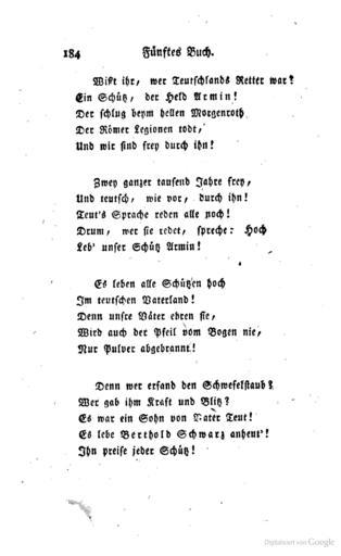 | Keywords: Gräter Das teutsche Schützenlied 2.png Das teutsche Schützenlied in Friedrich David Gräter Lyrische Gedichte nebst einigen vermischten Heidelberg 1809 S 184 http //books google com/books id mFxJAAAAYAAJ pg PA184 1797/1809 Friedrich David Gräter <gallery> File Gräter Das teutsche Schützenlied 1 png Datei 1 S 183 File Gräter Das teutsche Schützenlied 2 png Datei 2 S 184 File Gräter Das teutsche Schützenlied 3 png Datei 3 S 185 </gallery> PD-old-100 De Wikisource book | ||||