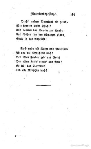| Keywords: Gräter Das teutsche Schützenlied 3.png Das teutsche Schützenlied in Friedrich David Gräter Lyrische Gedichte nebst einigen vermischten Heidelberg 1809 S 185 http //books google com/books id mFxJAAAAYAAJ pg PA185 1797/1809 Friedrich David Gräter <gallery> File Gräter Das teutsche Schützenlied 1 png Datei 1 S 183 File Gräter Das teutsche Schützenlied 2 png Datei 2 S 184 File Gräter Das teutsche Schützenlied 3 png Datei 3 S 185 </gallery> PD-old-100 De Wikisource book | ||||
