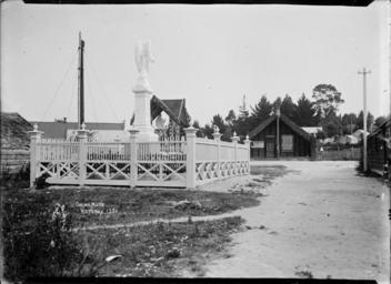 | Keywords: blackandwhite monochrome outdoor photo border black and white View of a memorial erected to the memory of Petera Te Pukuatua. The grave is situated at Ohinemutu near the Tama te Kapua Meeting House and the statue of Queen Victoria. It is surrounded by a wrought iron fence and further enclosed by a white fence. The gravestone has an inscription on one side (from angle of photo it can not be read) and there is a large figure of an angel on top of the plinth. Photograph taken by William A Price in Jan 1908. Inscriptions: Inscribed - Photographer's title on negative -bottom left: Ohinemutu. Rotorua. 1351bottom right: Protd. W.A.P. 10.1.08. (very faint). William Archer Price lived and practised in Queen Street, Northcote, 1909-1910. Source: New Zealand Post Office directories Quantity: 1 b&w original negative(s). Physical Description: Dry plate glass negative 4.75 x 6.5 inches Grave of Petera Te Pukuatua at Ohinemutu. Price, William Archer, 1866-1948 :Collection of post card negatives. Ref: 1/2-001439-G. Alexander Turnbull Library, Wellington, New Zealand. natlib.govt.nz/records/22791166 View of a memorial erected to the memory of Petera Te Pukuatua. The grave is situated at Ohinemutu near the Tama te Kapua Meeting House and the statue of Queen Victoria. It is surrounded by a wrought iron fence and further enclosed by a white fence. The gravestone has an inscription on one side (from angle of photo it can not be read) and there is a large figure of an angel on top of the plinth. Photograph taken by William A Price in Jan 1908. Inscriptions: Inscribed - Photographer's title on negative -bottom left: Ohinemutu. Rotorua. 1351bottom right: Protd. W.A.P. 10.1.08. (very faint). William Archer Price lived and practised in Queen Street, Northcote, 1909-1910. Source: New Zealand Post Office directories Quantity: 1 b&w original negative(s). Physical Description: Dry plate glass negative 4.75 x 6.5 inches Grave of Petera Te Pukuatua at Ohinemutu. Price, William Archer, 1866-1948 :Collection of post card negatives. Ref: 1/2-001439-G. Alexander Turnbull Library, Wellington, New Zealand. natlib.govt.nz/records/22791166 |