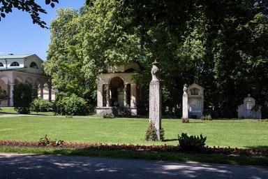 Keywords: graves cemetery park mausoleum rock carving art mourning live death trees funeral hall green