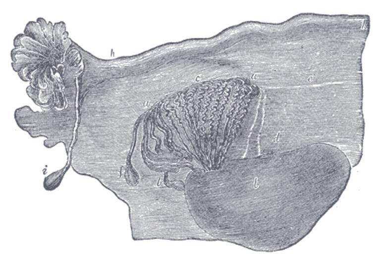 Keywords: Gray1162.png Adult ovary epoöphoron and uterine tube From Farre after Kobelt a a Epoöphoron formed from the upper part of the Wolffian body b Remains of the uppermost tubes sometimes forming hydatids c Middle set of tubes d Some lower atrophied tubes e Atrophied remains of the Wolffian duct f The terminal bulb or hydatid h The uterine tube i Hydatid attached to the extremity l The ovary Other fields 1 Information field Ucfirst Plate 1162 before 1858 Henry Gray Anatomy of the Human Body See Book section below 1162 Creator Henry Vandyke Carter Book Gray's Anatomy PD-old-100-1923 Gray's Anatomy plates 1162 Human ovary |