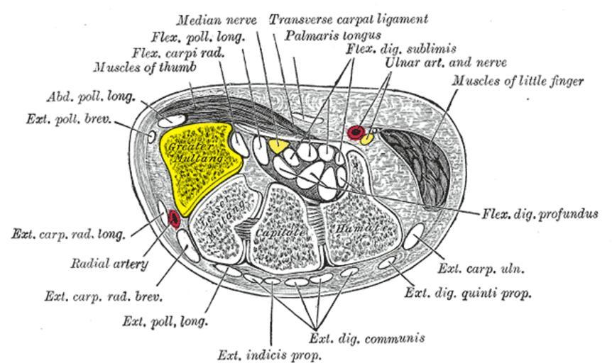 | Keywords: Gray422 - Trapezium.png en Transverse section across the wrist Palm on top thumb on left Trapezium is shown in yellow labelled as Greater Multang Other fields 1 Information field Ucfirst Plate 422 before 1858 Henry Gray Anatomy of the Human Body See Book section below 422 Creator Henry Vandyke Carter thumb left Original Book Gray's Anatomy PD-old-100-1923 Gray's Anatomy plates 0422 Trapezium bone | ||||