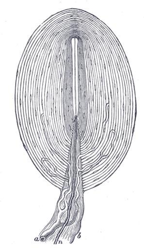Keywords: Gray935.png Pacinian corpuscle with its system of capsules and central cavity a Arterial twig ending in capillaries which form loops in some of the intercapsular spaces and one penetrates to the central capsule b The fibrous tissue of the stalk n Nerve tube advancing to the central capsule there losing its white matter and stretching along the axis to the opposite end where it ends by a tuberculated enlargement Other fields 1 Information field Ucfirst Plate 935 before 1858 Henry Gray Anatomy of the Human Body See Book section below 935 Creator Henry Vandyke Carter Book Gray's Anatomy PD-old-100-1923 Gray's Anatomy plates 0935 Filippo Pacini Tactile sensation |