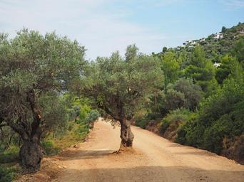 Keywords: greece mountains way sand olive trees summer clouds green nature