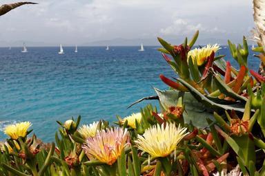 Keywords: greece rhodes sea water boot sailing boat sky clouds flowers cactus