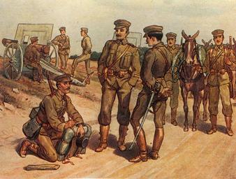 Keywords: Greek artillery, 1910.png en Painting of Greek artillerymen with the new khaki uniforms adopted in 1908 History of the Hellenic Nation Vol XIV p 187 Panos Aravantinos 1886-1930 ~ 1910 PD-old-70-1923 Military uniforms of Greece Hellenic Army Artillery of Greece Artillery in art |