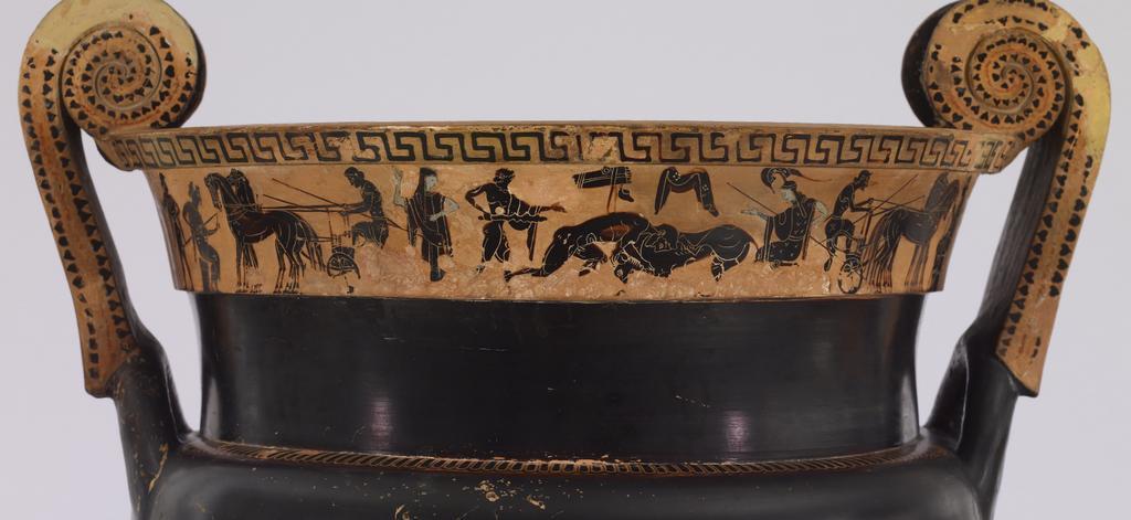 | Keywords: Greek - Black-figure Volute Krater - Walters 4829 - View A Detail.jpg  Beneath the meander-adorned rim of this large volute krater is a band of figural decoration interrupted by the handles on each side At the center of the scene on one side is a trio of warriors each wearing a short chiton and a full panoply of armor The central figure lunges deeply to the right as he looks back at the soldier behind him The figure on the left prepares to plunge his raised spear into the central warrior The third soldier on the right also wields a spear in his upraised right hand poised to strike Flanking this central pair are two women in long decorated garments Each raises her hands as if to address the men or express alarm Behind the woman on the right is a horse and young man perhaps a groom Beyond them are four more figures including a naked youth with a mantle two men with staffs and another fully armed warrior To the left of the central scene behind the woman an armed warrior mounts a chariot as if ready to flee from the fighting A man seated in front of the horses interrupts the sense of motion evoked by the charioteer The two figures behind the seated man resemble those at the other end of the scene a naked youth wearing a mantle and holding a staff or spear and a standing man in longs robes with a staff Reminiscent of the central trio of warriors three figures occupy the center of the scene on the opposite side in a representation of Herakles wrestling the Nemean lion with a youth perhaps Iolaos at hand offering support as he holds the hero's club As with the composition on the other side the figures are flanked by two female figures - a seated Athena on the right and a woman fleeing on the left Further connecting the scenes is the depiction of charioteers mounting their chariots which once again face seated men with staffs A standing man with a staff frames the scene at either end Warriors figure prominently on both sides of this vase which appears to celebrate the physical prowess of the central figures The scenes highlight conduct in war and wrestling two activities in which male citizens would have been trained and encouraged to emulate their heroic prototypes ca 525 500 BC terracotta H 23 1/16 x W 20 1/2 x Diam 16 15/16 in 58 5 x 52 x 43 cm accession number 48 29 13467 Don Marcello Massarenti Collection Rome before 1897 mode of acquisition unknown cat no 209 Henry Walters city Baltimore Walters Art Museum Henry Walters Acquired by Henry Walters with the Massarenti Collection 1902 Heroes Mortals and Myths in Ancient Greece The Walters Art Museum Baltimore; Frist Center for the Visual Arts Nashville; San Diego Museum Of Art San Diego; Alexander S Onassis Public Benefit Foundation USA New York 2009-2011 place of origin Attica Greece Walters Art Museum license Ancient Greek black-figure pottery in the Walters Art Museum Art from Greece Media contributed by the Walters Art Museum needs category review |