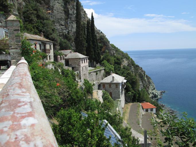 Keywords: greek buildings sea houses mountain monastery mediterranean sea