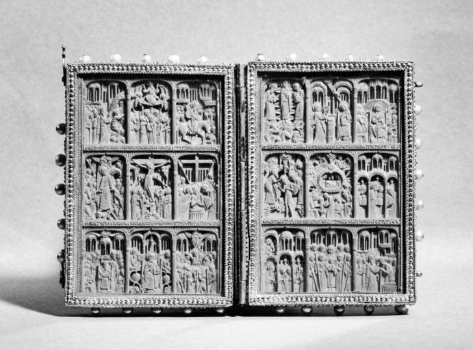 Keywords: Greek - Diptych Icon with Feasts of the Church - Walters 61174.jpg This finely carved wooden diptych two-panel icon is set in an elaborate silver frame decorated with pearls Its outside has images of Saint George and Saint Demetrius on horseback When open the diptych was used for personal prayer Its eighteen small scenes correspond to major feast days of the church calendar the Raising of Lazarus Ascension Entry into Jerusalem Resurrection Crucifixion Lamentation Pentecost Saint Nicholas Dormition Death of the Virgin; Transfiguration Annunciation Mid-Pentecost Luke 4 16-28 Baptism Nativity Presentation of Christ in the Temple Presentation of the Virgin in the Temple Synaxis Assembly of the Archangels and Healing of the Blind Man century 18 Early Modern boxwood gilt on silver pearls modern textile cm 8 11 4 1 1 accession number 61 174 36957 Henry Walters Baltimore date of acquisition unknown by purchase Walters Art Museum Henry Walters Acquired by Henry Walters Shrunken Treasures Miniaturization in Books and Art The Walters Art Museum Baltimore 2009 place of origin Greece Walters Art Museum license Medieval ivory in the Walters Art Museum Art from Greece Media contributed by the Walters Art Museum needs category review
