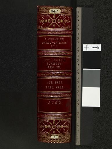 | Keywords: Greek-Latin Glossary - Spine (Harley ms 5792).jpg Style Harleian centrepiece and border of small tools; Caption Spine; Colour Red/brown; Edge Unspecified exhibition history Decorative Technique Panel stamp in gold; Cover Material Unspecified Binding of red morocco gilt in 'Harleian' style by Chapman object history Text 8c; Unspecified; Unspecified object type Cc-zero place of creation Binding England place of discovery Unspecified British Library image http //www bl uk/catalogues/bookbindings/LargeImage aspx RecordId 020-000018440 ImageId ImageId 57100 Copyright BL Greek-Latin Glossary Uploaded with GWToolset Greek-Latin Glossary - Spine Harley ms 5792 http //www webarchive org uk/bldatasets/bindings/harley_ms_5792_fbspi jpg Bookbinding 18th-century bookbinding British Library Bookbindings |
