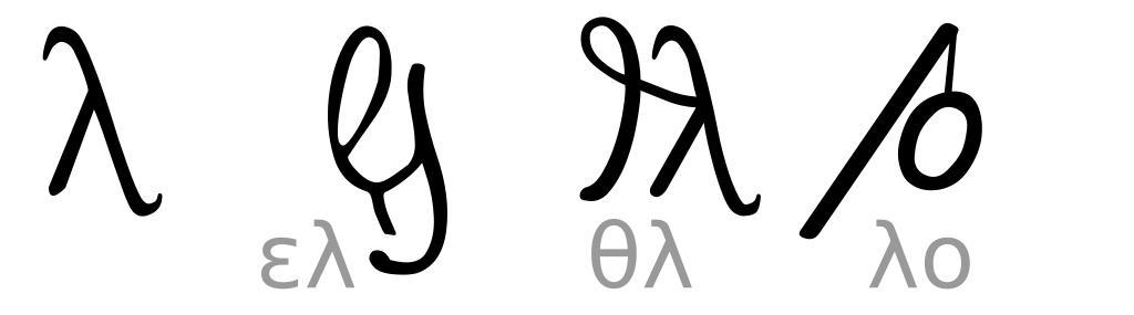 | Keywords: Greek minuscule Lambda with ligatures.svg en Samples of ligatures involving Greek letter Lambda in medieval minuscule handwriting and early modern printing own based on glyphs in the Rgreekl2 font made by Vernon Kooy http //schmidhauser us/tools/rgl/rgreekl2 pdf Fut Perf 2010-08-14 Lamda letter Greek ligatures λ |