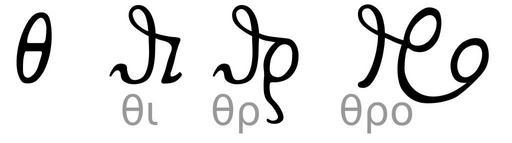 | Keywords: Greek minuscule Theta with ligatures.svg en Samples of ligatures involving Greek letter Theta in medieval minuscule handwriting and early modern printing own based on glyphs in the Rgreekl2 font made by Vernon Kooy http //schmidhauser us/tools/rgl/rgreekl2 pdf Fut Perf 2010-08-14 Theta letter Greek ligatures θ |