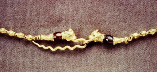 | Keywords: Greek - Necklace with Clasp of Two Bull Heads - Walters 57598 - Detail.jpg This necklace is composed of 85 hollow gold beads the openings edged with twisted wire The beads are threaded onto a chain made of double loops of wire constricted in their centers and twisted so that the end loops are in perpendicular planes The bulls' head finials have a collar consisting of a garnet bead held between gold cups encircled by smooth and twisted wire and a row of tongues Each collar terminates in a gold cone then a ring of twisted wire and is attached to the chain by coiled hollow wire The forelock and mane of the bull are chased; the inlay of the eyes is missing One bull holds in its mouth the hook the other the loop Chain necklaces threaded with gold or garnet beads and ending in animal head terminals were popular throughout the Hellenistic period century 4 3 BC Hellenistic gold garnet cm 49 5 l ; clasp cm 1 15 0 5 accession number 57 598 4664 Jean Lambros and Giovanni Dattari Collection Athens and Cairo date and mode of acquisition unknown Collection of Jean Lambros et Giovanni Dattari Sale Hotel Drouot Paris June 17-19 1912 lot 572 Henry Walters city Baltimore Walters Art Museum Henry Walters Acquired by Henry Walters 1912 Objects of Adornment Five Thousand Years of Jewelry from the Walters Art Gallery Baltimore Cooper-Hewitt National Design Museum New York; Chrysler Museum of Art Norfolk; Carnegie Museum of Art Pittsburgh; San Antonio Museum of Art San Antonio; Philbrook Museum of Art Tulsa; Honolulu Academy of Arts Honolulu; New Orleans Museum of Art New Orleans; Milwaukee Art Museum Milwaukee; Minneapolis Institute of Arts Minneapolis; Toledo Museum of Art Toledo; The John and Mable Ringling Museum of Art Sarasota 1984-1987 From Alexander to Cleopatra Greek Art of the Hellenistic Age The Walters Art Gallery Baltimore 1988-1989 Jewelry - Ancient to Modern The Walters Art Gallery Baltimore 1979-1980 Jewelry from the Walters Art Museum and the Zucker Family Collection The Walters Art Gallery Baltimore 1987 place of origin Greece Walters Art Museum license Ancient Greek art in the Walters Art Museum Jewellery in the Walters Art Museum Art from Greece Media contributed by the Walters Art Museum needs category review |