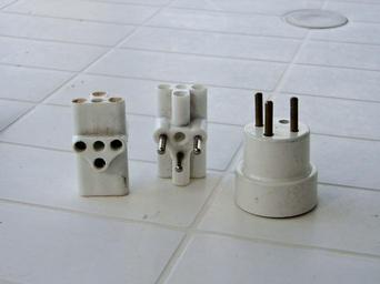 Keywords: Greek old three-pin 3-way adaptor plug.JPG greek old three pin plug three-way adaptor front and back These adaptors belong to the old greek standard practically abandoned by 1995 Previous to the large-scale adoption of schuko plugs this was the only way to use an earthed appliance A schuko adaptor is seen on the right Own 2007-09-24 Korkon Mains adaptors |
