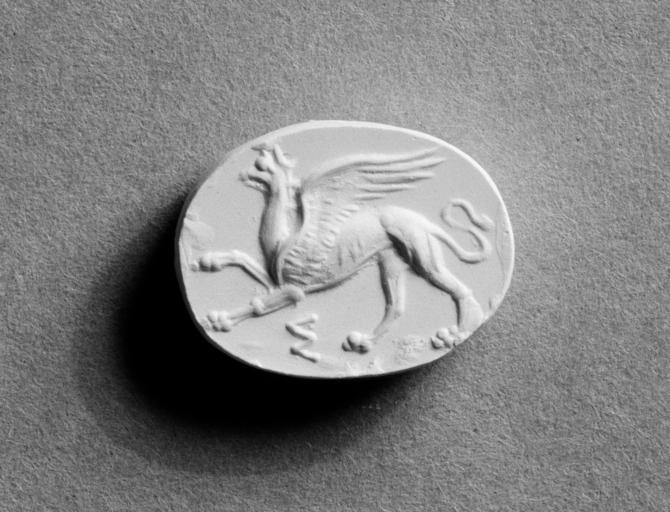 | Keywords: Greek - Scaraboid with Griffin - Walters 42865 - Top.jpg This scaraboid depicts a griffin to the right and is carved intaglio century 5 BC rock crystal cm 1 8 accession number 42 865 17022 Evans date and mode of acquisition unknown 1905 catalogue plate 2 25 Henry Walters New York date and mode of acquisition unknown Sadie Jones Mrs Henry Walters New York 1931 by inheritance Mrs Henry Walters Sale Joseph Brummer New York 1942 Walters Art Museum 1942 by purchase Museum purchase formerly part of the Walters Collection 1942 Things With Wings Mythological Figures in Ancient Greek Art Ward Museum Salisbury 2009 place of origin Greece Walters Art Museum license Ancient Greek art in the Walters Art Museum Art from Greece Media contributed by the Walters Art Museum needs category review Reliefs of griffins |