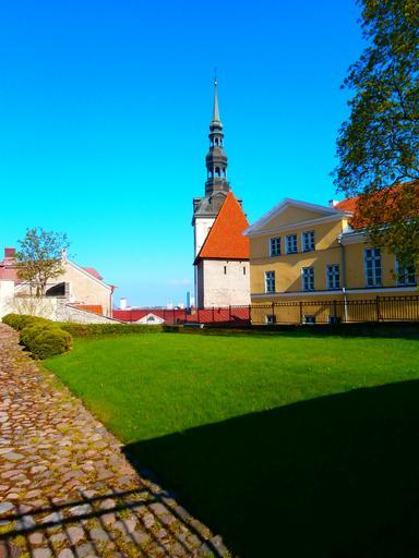 Keywords: green church oleviste old town tallinn estonia estland yellow colorful sky blue color