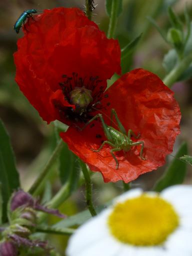 Keywords: green grasshopper green beetle poppy ababol rosella spring flowers insects