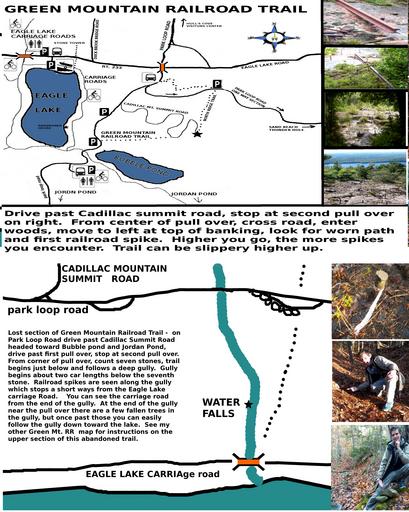 Keywords: acadia national park nationalpark national parks nationalparks anp mount desert island mountdesertisland mdi bar harbor barharbor maine new england newengland back packing backpacking hiking trail hikingtrail trails camping cadillac mountain cadillacmountain green mountain greenmountain green mountain railroad greenmountainrailroad trains cog trains cogtrains eden eagle lake eaglelake abandoned trails abandonedtrails ghost trails ghosttrails phantom trails phantomtrails text outdoor A cog train once operated between Eagle Lake and the summit of Green Mountain (renamed Cadillac) in what is now Acadia National Park. When the train company went out of business, the rails were all pulled up, except for one section of rail, and sold for scrap metal. That one piece of rail still lies along the route the train took. We know the exact route of the train because the railroad spikes had been driven so deep into the granite they could not be removed and they still mark the route today. Years ago I discovered the route which begins at the park loop road and runs to the summit and mapped it out. This past year after doing some searching I discovered the section of the train route which ran from the park loop road to the Eagle Lake carriage road, with Eagle lake just several yards away. The train route became a popular hiking trail for many years, some time after the land became Acadia National Park the trail was abandoned, but locals still hike it today. A cog train once operated between Eagle Lake and the summit of Green Mountain (renamed Cadillac) in what is now Acadia National Park. When the train company went out of business, the rails were all pulled up, except for one section of rail, and sold for scrap metal. That one piece of rail still lies along the route the train took. We know the exact route of the train because the railroad spikes had been driven so deep into the granite they could not be removed and they still mark the route today. Years ago I discovered the route which begins at the park loop road and runs to the summit and mapped it out. This past year after doing some searching I discovered the section of the train route which ran from the park loop road to the Eagle Lake carriage road, with Eagle lake just several yards away. The train route became a popular hiking trail for many years, some time after the land became Acadia National Park the trail was abandoned, but locals still hike it today.
