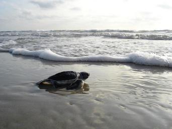 Keywords: green sea turtle hatchling beach ocean surf sand wildlife nature baby newborn small young marine walking
