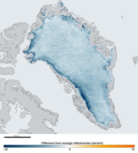 | Keywords: Greenland Albedo Change.png  Greenland reflected in the summer of 2011 versus the average percent it reflected between 2000 to 2006 Virtually the entire ice sheet shows some change with some areas reflecting close to 20 percent less light than a decade ago The map is based on observations from the Moderate Resolution Imaging Spectroradiometer MODIS instruments on NASA ™s Terra and Aqua satellites It was produced as part of the National Oceanic and Atmospheric Administration ™s Arctic Report Card 2012-02-12 http //earthobservatory nasa gov/IOTD/view php id 76916 http //eoimages gsfc nasa gov/images/imagerecords/76000/76916/greenlandalbedo_mod_2011_lrg jpg Map by NOAA ™s climate gov team based on NASA satellite data processed by Jason Box Byrd Polar Research Center the Ohio State University Scanning electron microscope photos courtesy the Electron and Confocal Microscopy Laboratory USDA Agricultural Research Service PD-USGov Uploaded with UploadWizard Glaciology of Greenland Climate change Global warming |